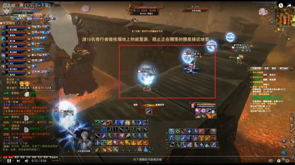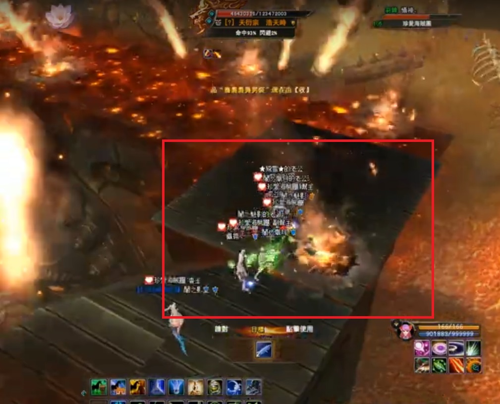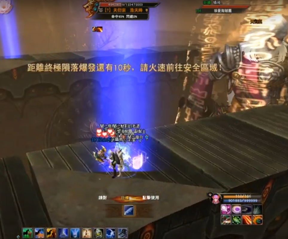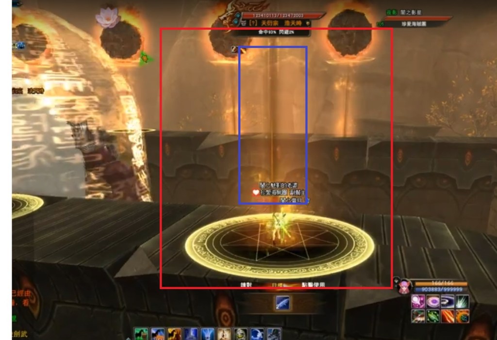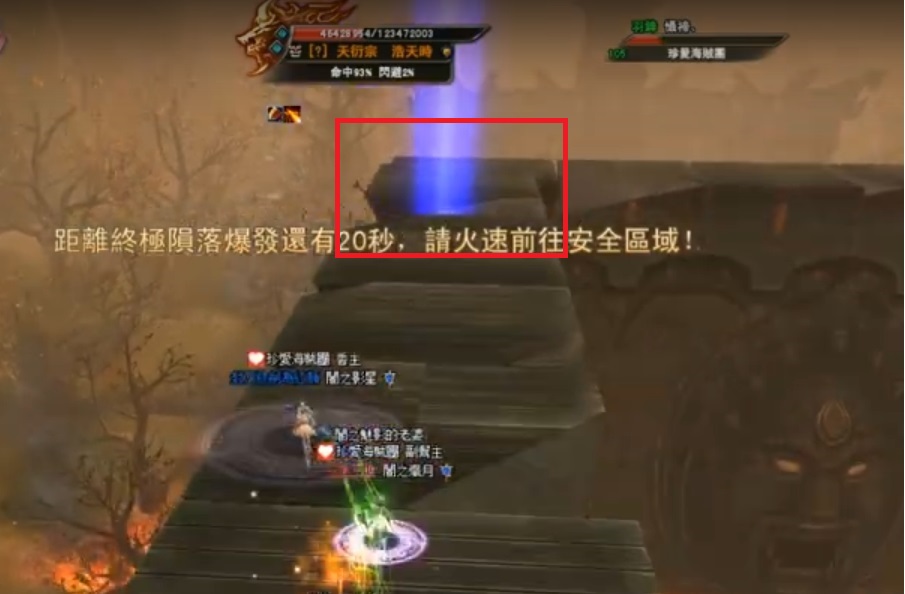 吸完閃電後 要到王的左右兩邊 平台會出現一條黑線(如圖藍線框) 而後腳下會出現黃色光圈(如圖紅色線框)如果來不及站好位置 等待著的就是秒殺 全滅後 若無魅靈重生 可回城到舊百人傳送師再傳送進入
