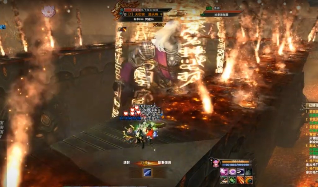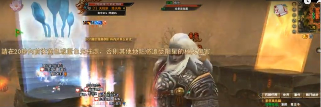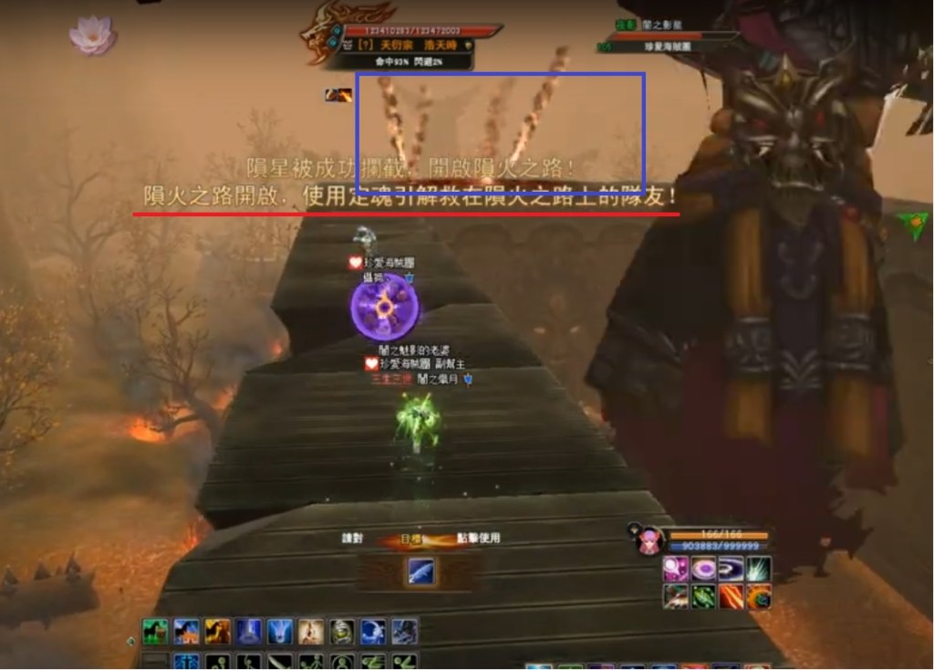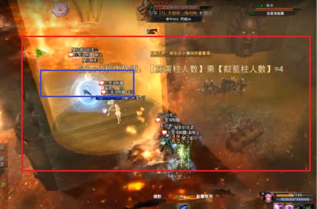 其間會出現藍 黃兩圈 因為 火路出現時 所有人都會站在同一排 這時 要安排移動速度快的刺或夜影或肉肉(以團隊裡跑速快的職業)到對面去站 然後 跑到位置後拉一位隊友過去(我們是拉補師或魅靈去補血的)