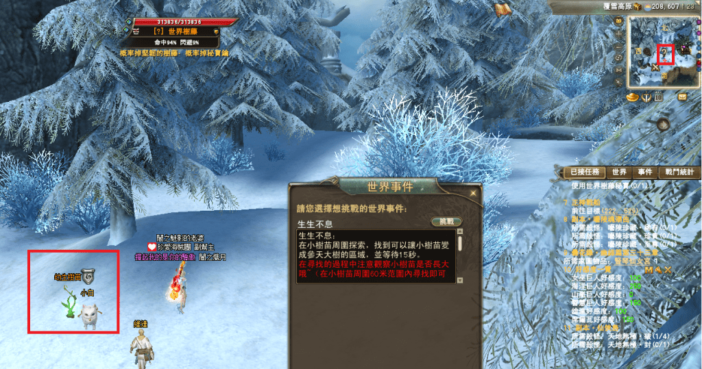 (西路白天方可觸發。聊天框普通頻道,會有紅色字體提示:世界樹第二根鬚和第三根鬚現在是白天/黑夜。第一個坐標接任務,第二個坐標踩了之後,回頭看小樹苗,它會變成大樹,再等15S,提示完成即可離開。)