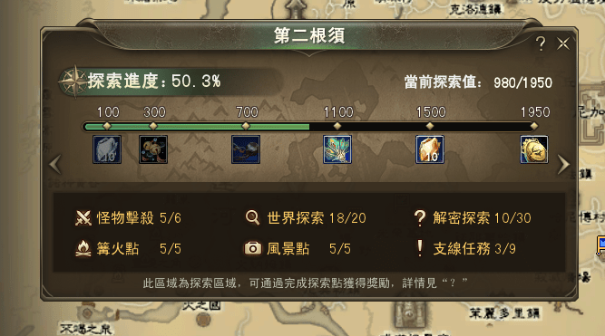 到達西路之後,M鍵,然後右上角有第二根鬚的總進度提示(六邊形),點它,進入詳細界面。共分六大類。怪物擊殺、世界探索、解密探索、篝火點、風景點、支線任務。相應進度的獎勵鼠標左鍵點擊領取。