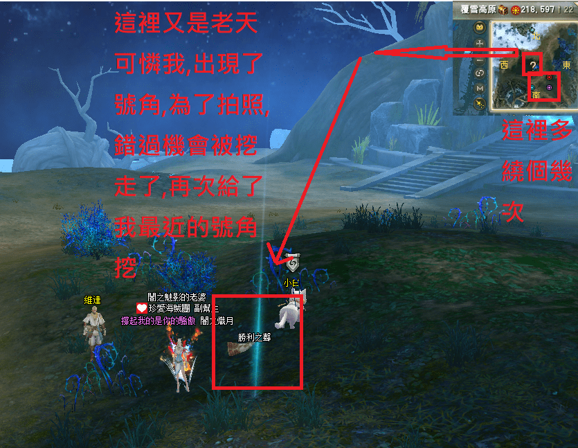 (U鍵音樂音量關小,音效音量開大,聽到號角吹響後再移動,第三聲響後再小範圍轉一轉,第四聲就會出現號角讓你挖取,若未完成可放棄重接。每個坐標代表的是一個範圍而不是一個點,多走走)