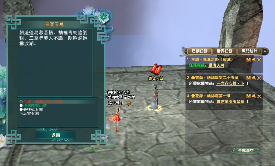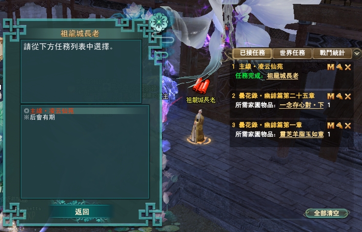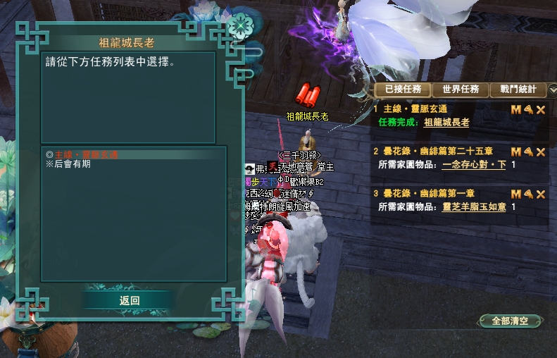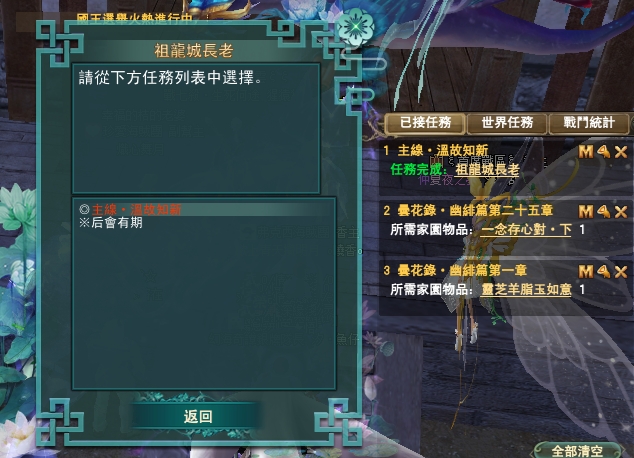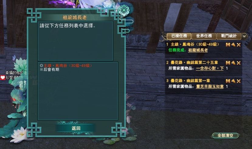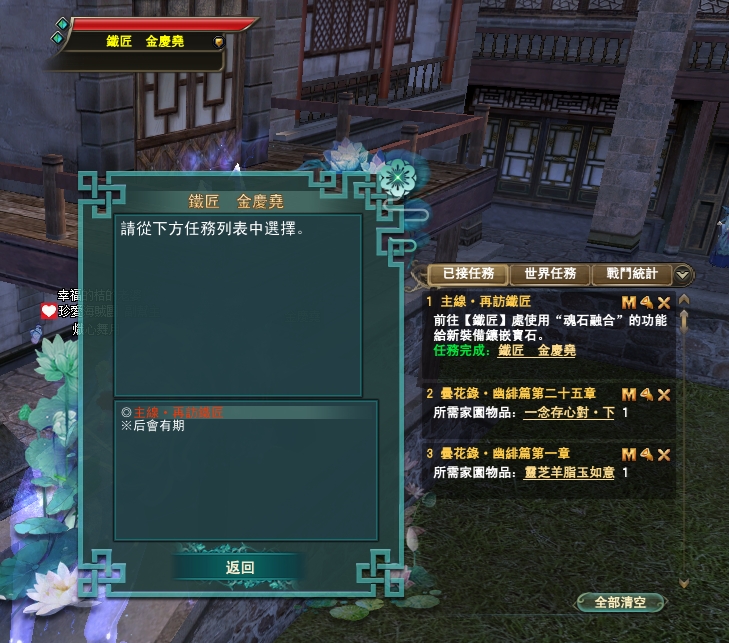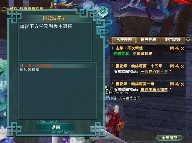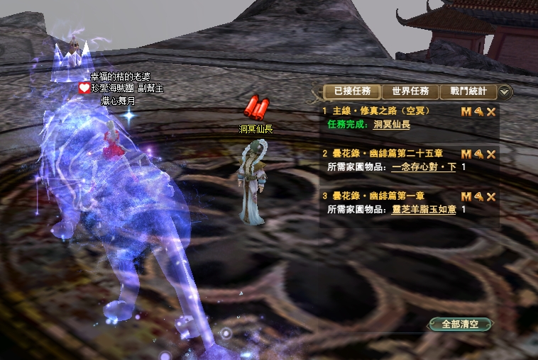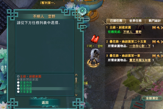 114/04/10 家園任無法進入自己的人,請到別人家去解,每個任務都等上10分鐘唷,目前知道的是會卡在絳玉這部分,感謝雪陵坊的幫主協助告知任務,謝謝您~~
