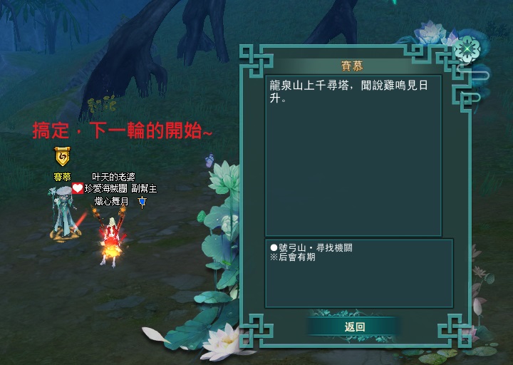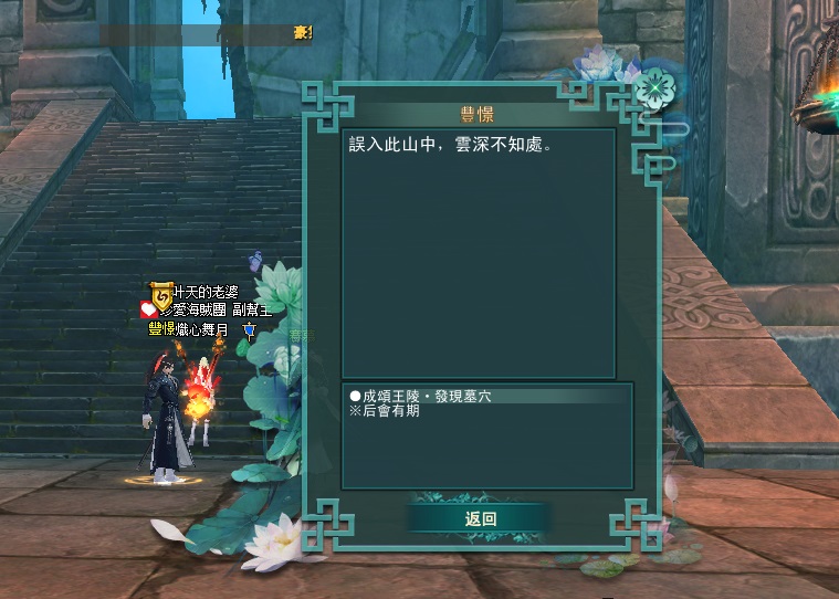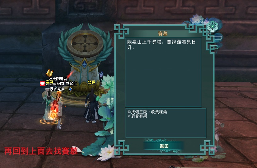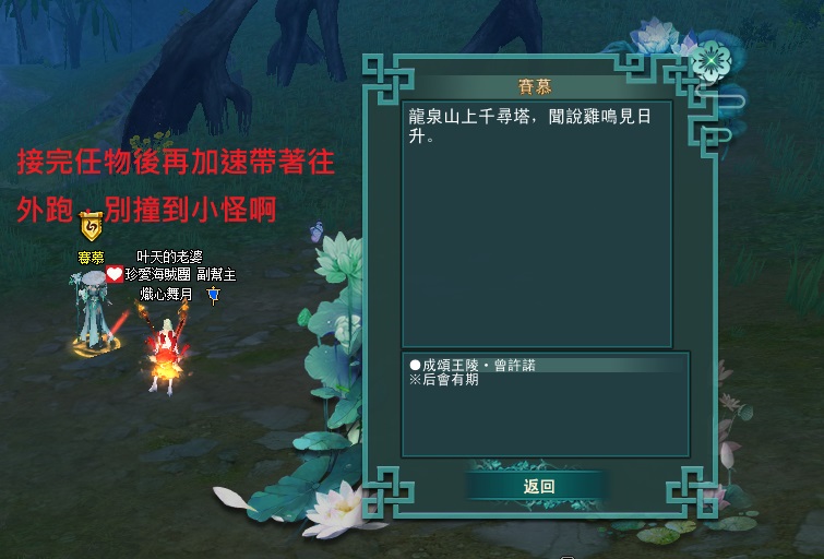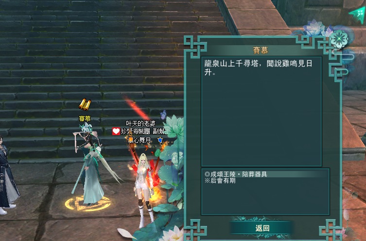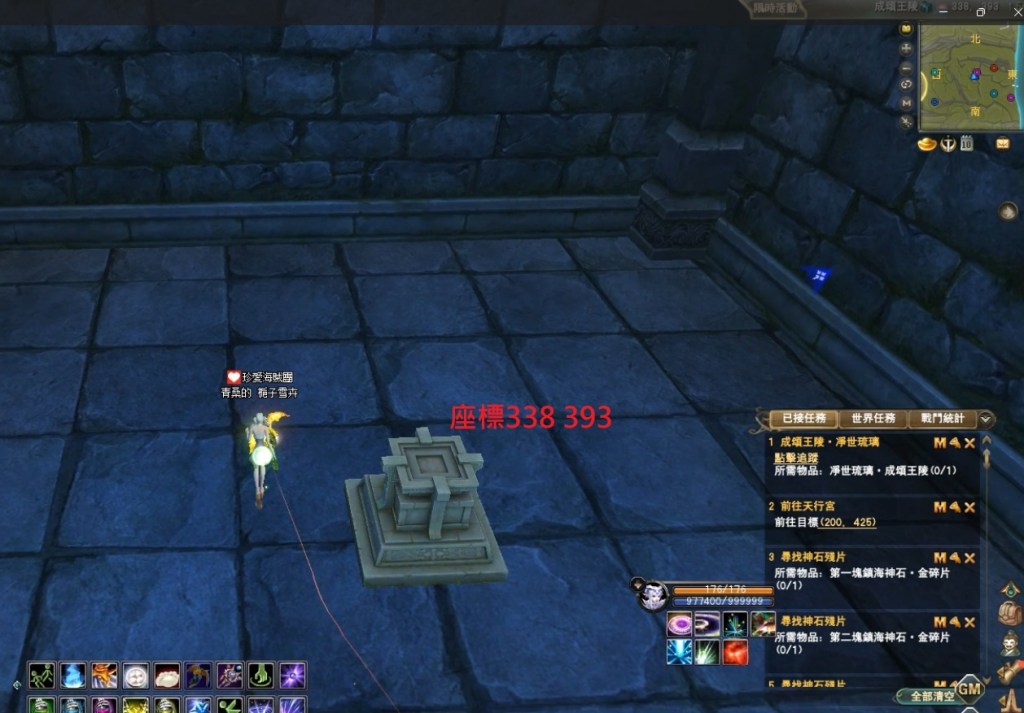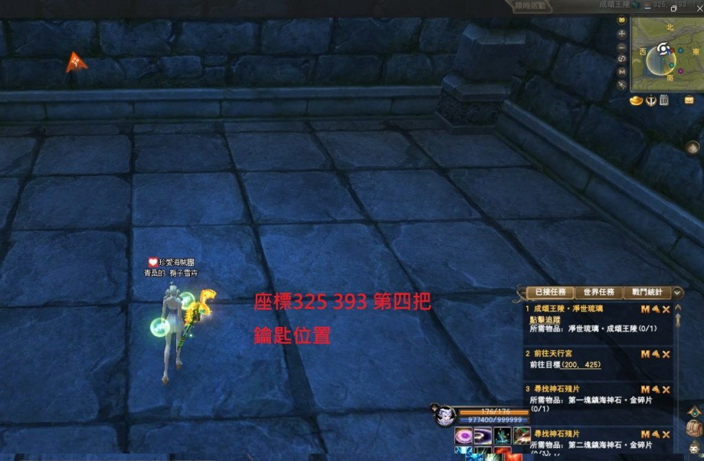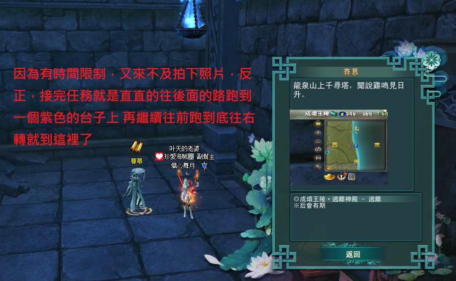 東陸世界•龍泉山的秘密第4章 明鏡台•尋物(成頌王陵完成接號弓山)附加影片 2025-04-122025-05-12 熾心舞月 補件任務第一張 先到這邊再往前跳下去的意思就是 你跳下去後 往 315 390 座標前去 會直接到王陵的門口再進入王陵找npc接任 分享此文: 按一下即可分享至 X(在新視窗中開啟) X 按一下以分享至 Facebook(在新視窗中開啟) Facebook 喜歡 正在載入... 相關