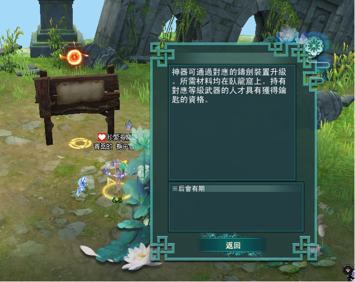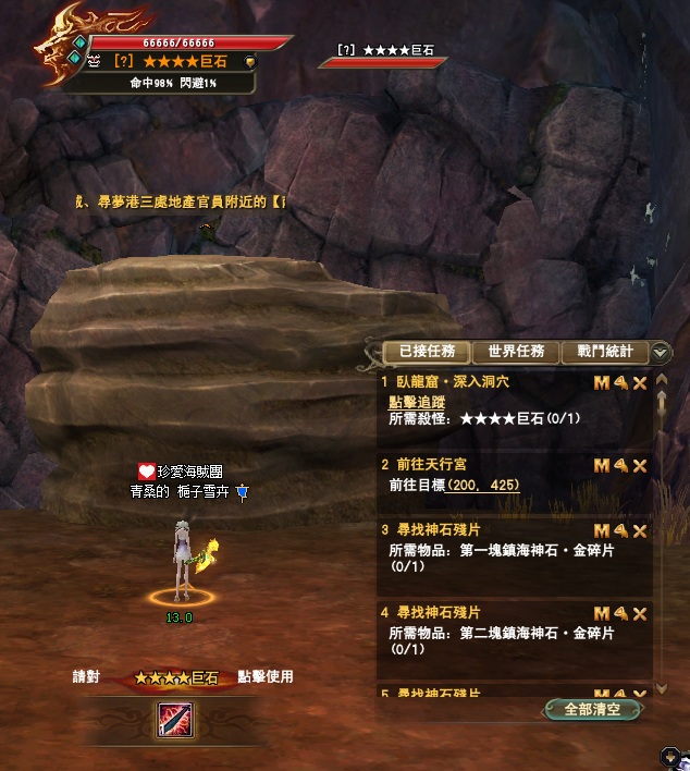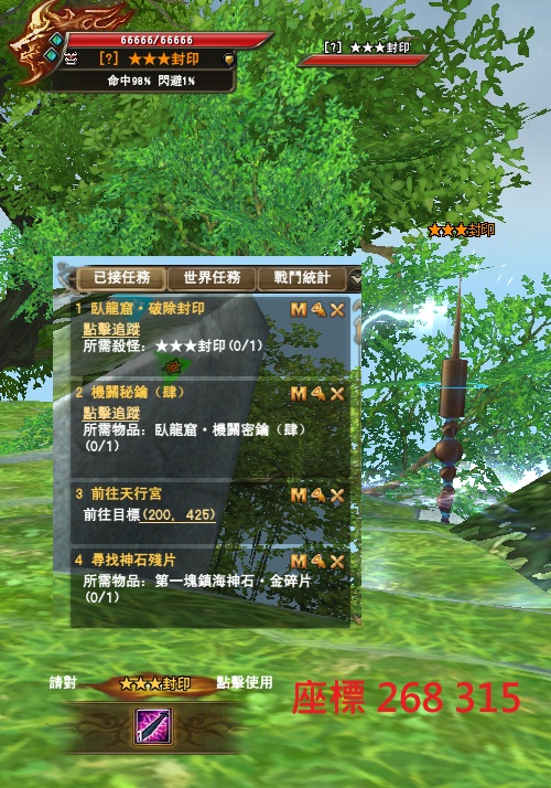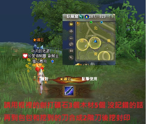 東陸世界·龍泉山的秘密第2章(臥龍窟完成接明台鏡任) 2025-04-122025-05-12 熾心舞月 OS:因為有的圖我合的太快,所以,有些任務接著解就好 藍色那把刀記得要挖 砍柴會用到 第一把碎片就在木頭下 記得要砍5根木頭 好~~是2個礦石 收集到要合成第2階 物品在包包裡 第二把鑰匙 座標 268 315 合好第3階後 旁邊會有一個雷匣的封印 要兩個 一樣用合好的刀去劈 這是第2個雷匣 要打五隻野狼 哇完後回到267 319 高81 的山洞去啟動機關 裡面剛好有一個炁球在鑰匙上面 機關後面有一片山壁 一樣給他劈下去 下面圖表的位置座標 分享此文: 按一下即可分享至 X(在新視窗中開啟) X 按一下以分享至 Facebook(在新視窗中開啟) Facebook 喜歡 正在載入... 相關