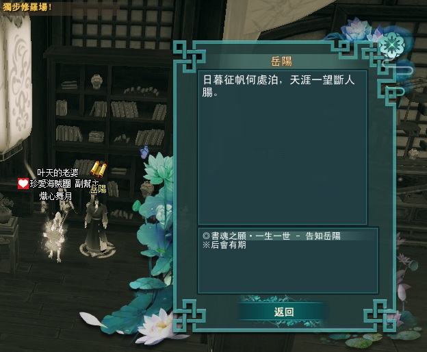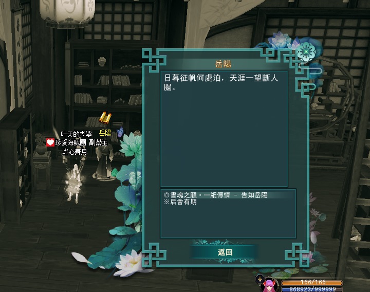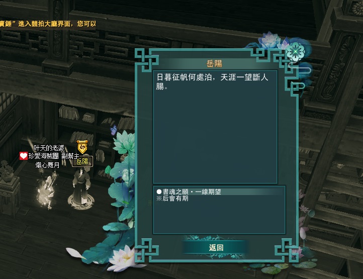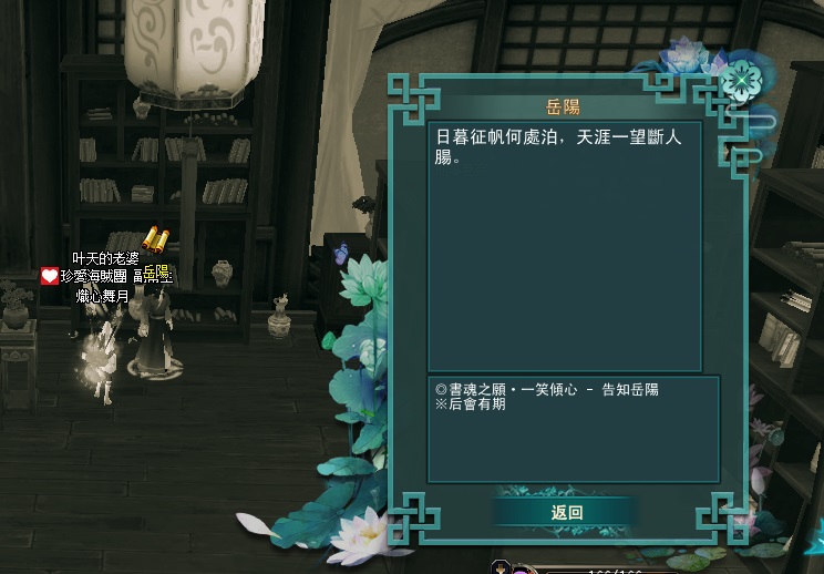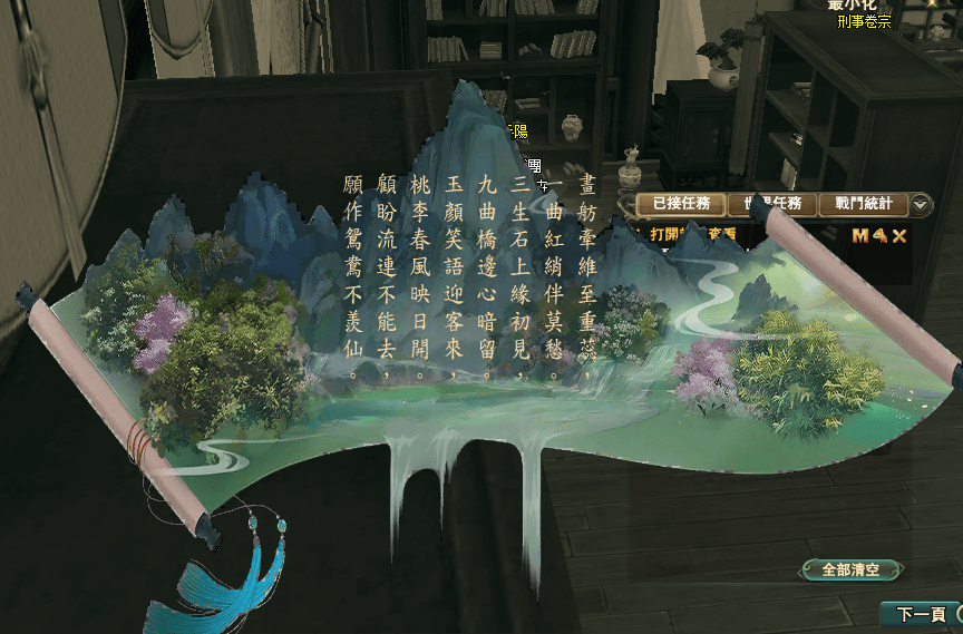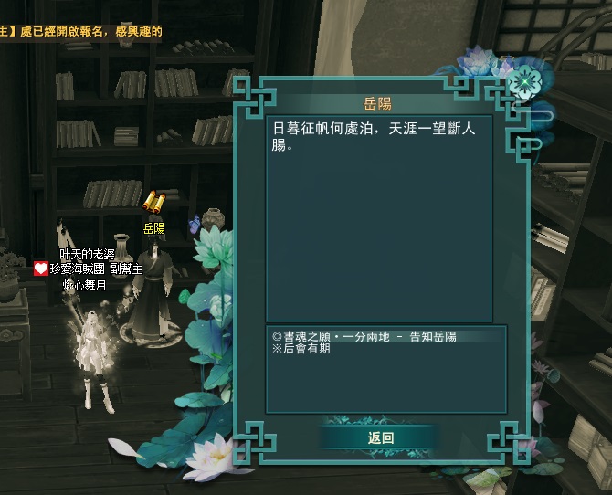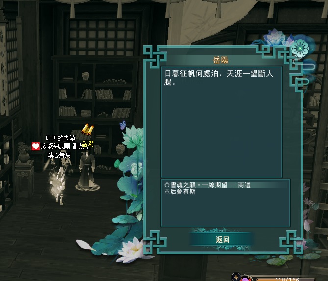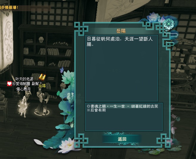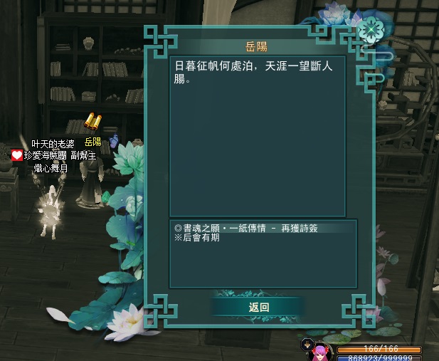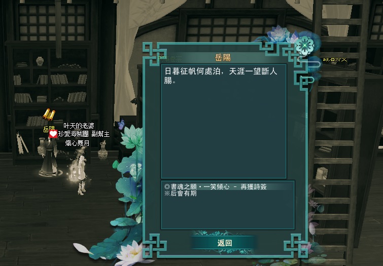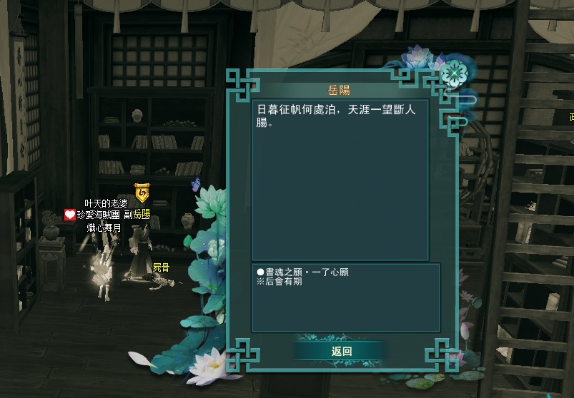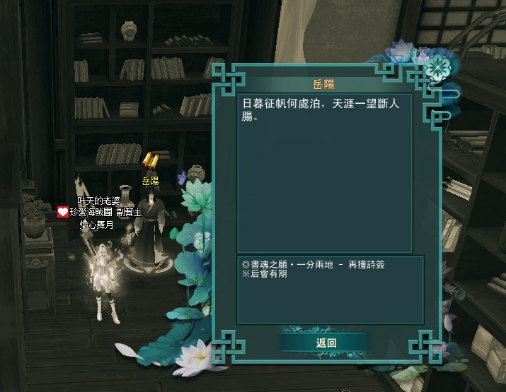 東陸奇遇·書魂之願(單一任務~解完後24小時時間才會出現草堂任的孫管家)接續伯仁之死… 定鼎天街完成 2025-05-122025-05-25 熾心舞月 記得要先點一下NPC 才會出現這畫面 在包包裡面 密碼 139 在聖行宮台的下方 座標 151 420 高 55 分享此文: 按一下即可分享至 X(在新視窗中開啟) X 按一下以分享至 Facebook(在新視窗中開啟) Facebook 喜歡 正在載入... 相關