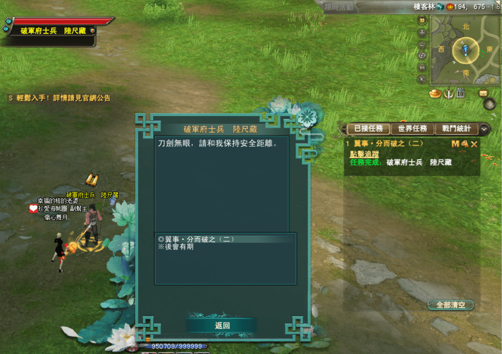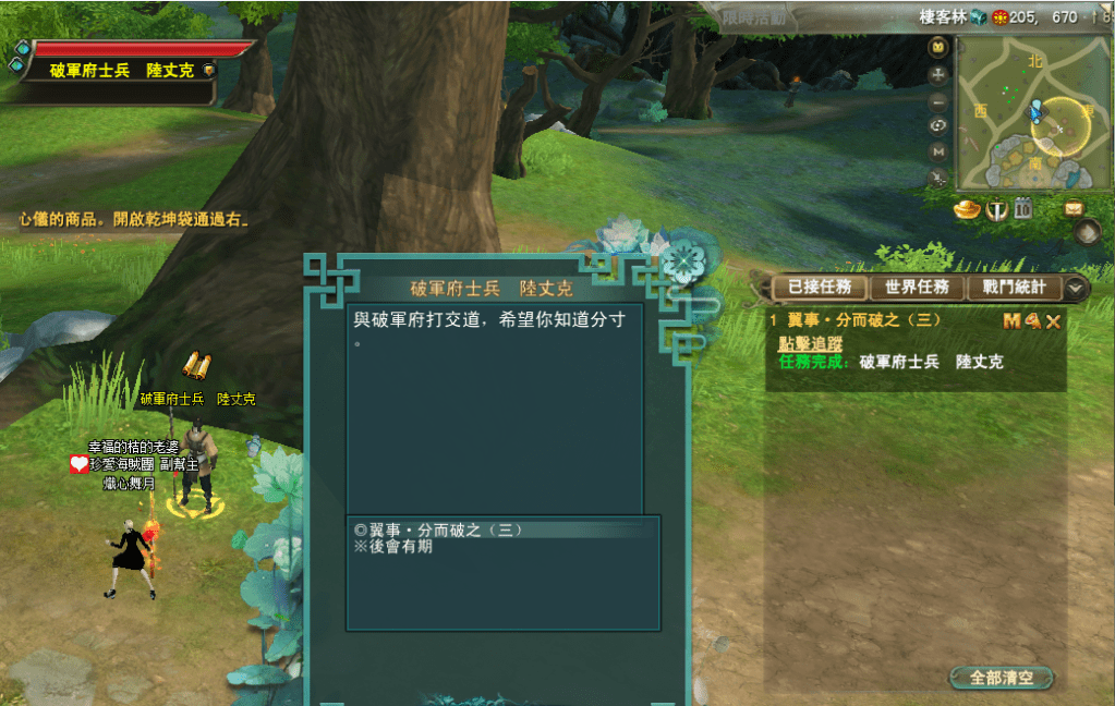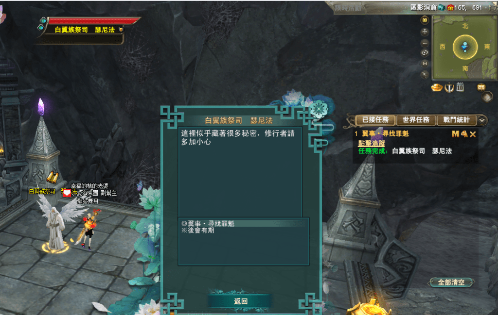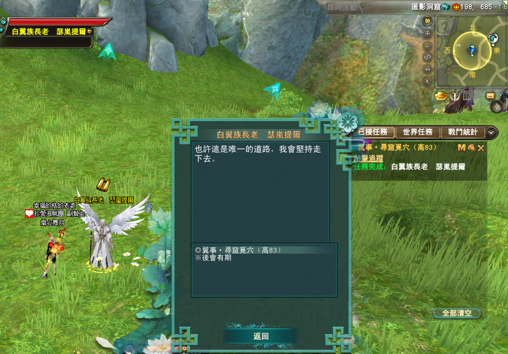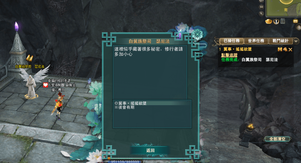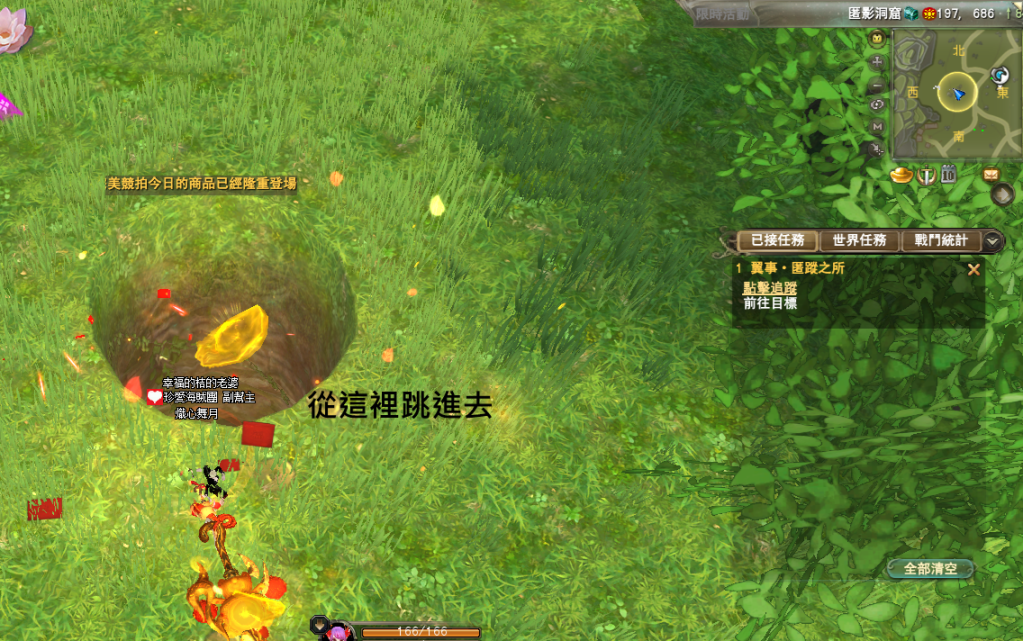 世界-同源黑白~翼事•叁(這篇才是往匿影洞窟任,同源黑白系列結束) 2025-11-082025-11-12 熾心舞月 npc這附近的3顆大樹點了就會出現斧頭 點下斧頭樹會消失 每次只有3分時間 一但斧頭消失 放棄任務會再重新給任用斧頭 這裡就是大家要找的炁跟寶箱要進去洞窟的傳點 分享此文: 按一下即可分享至 X(在新視窗中開啟) X 按一下以分享至 Facebook(在新視窗中開啟) Facebook 喜歡 正在載入... 相關