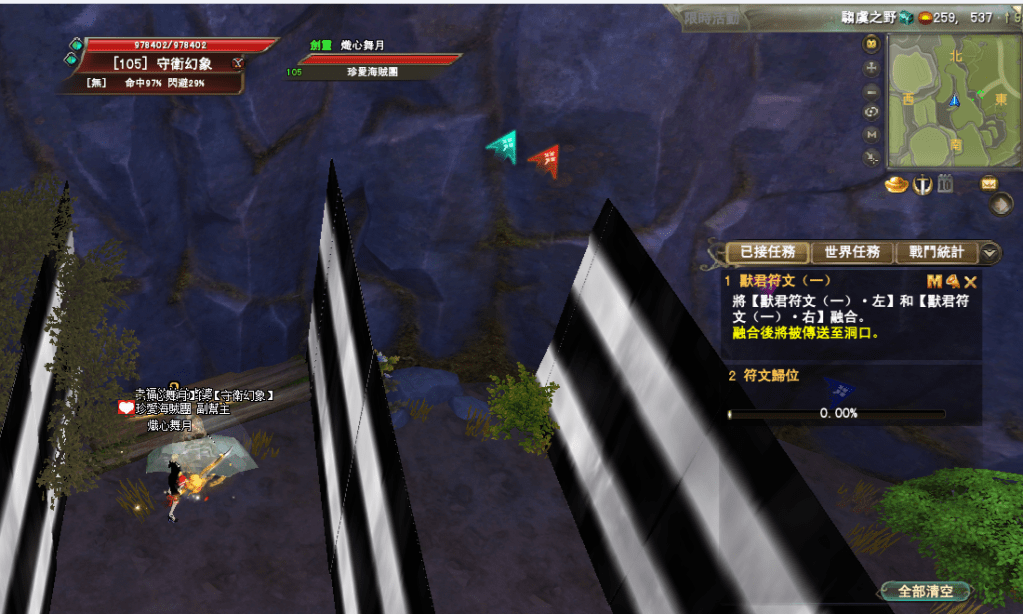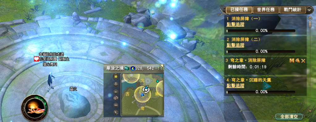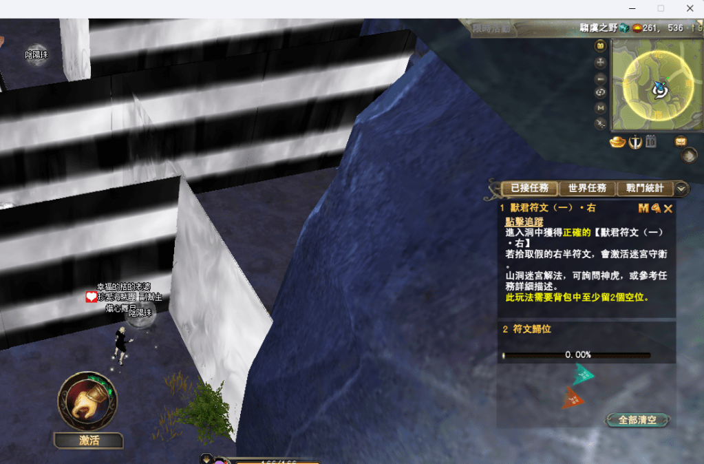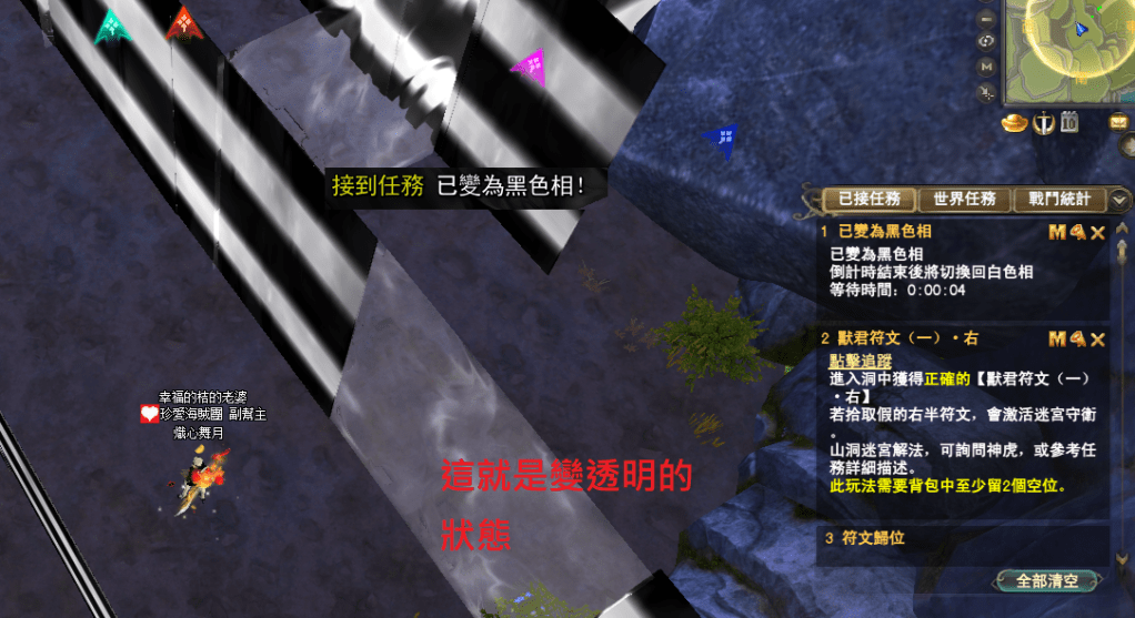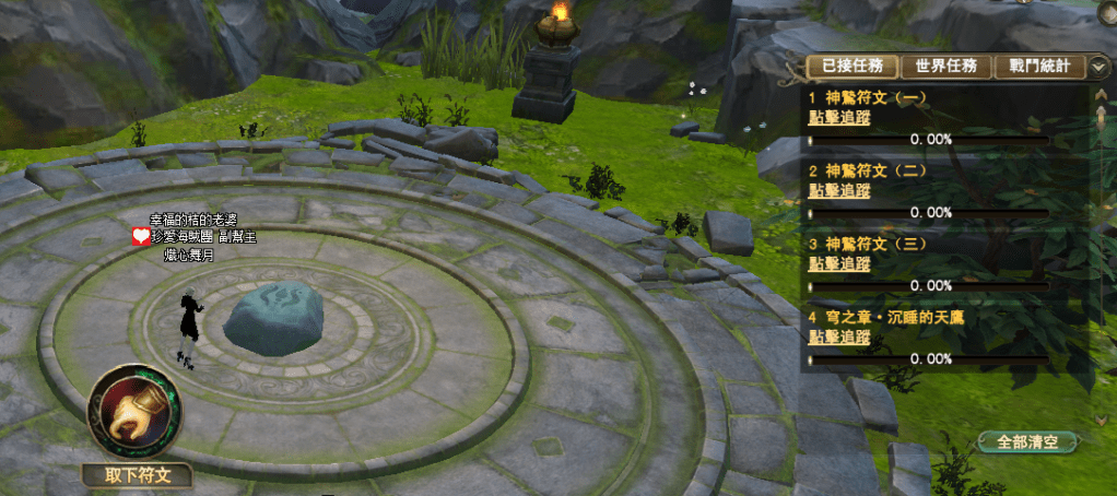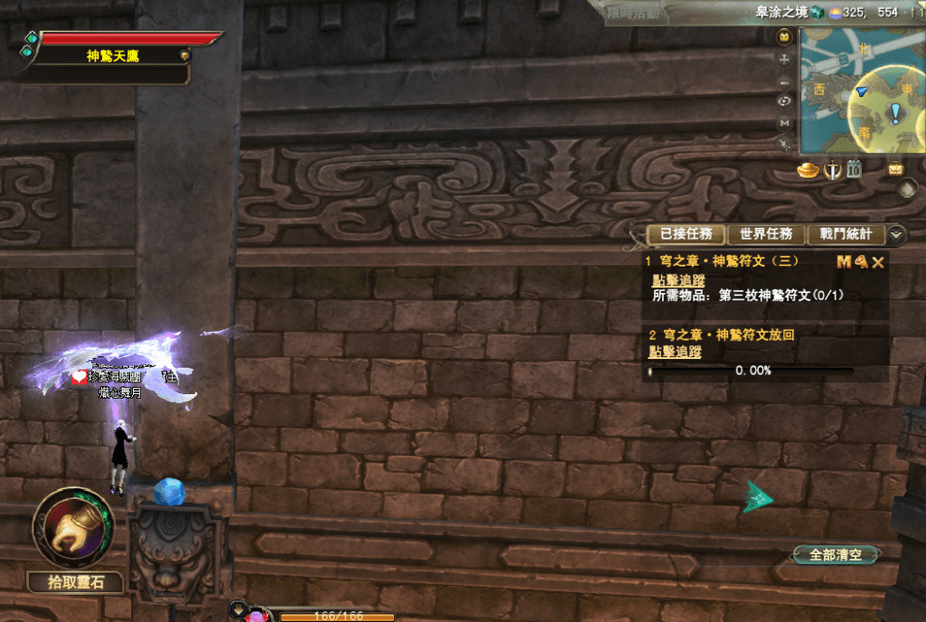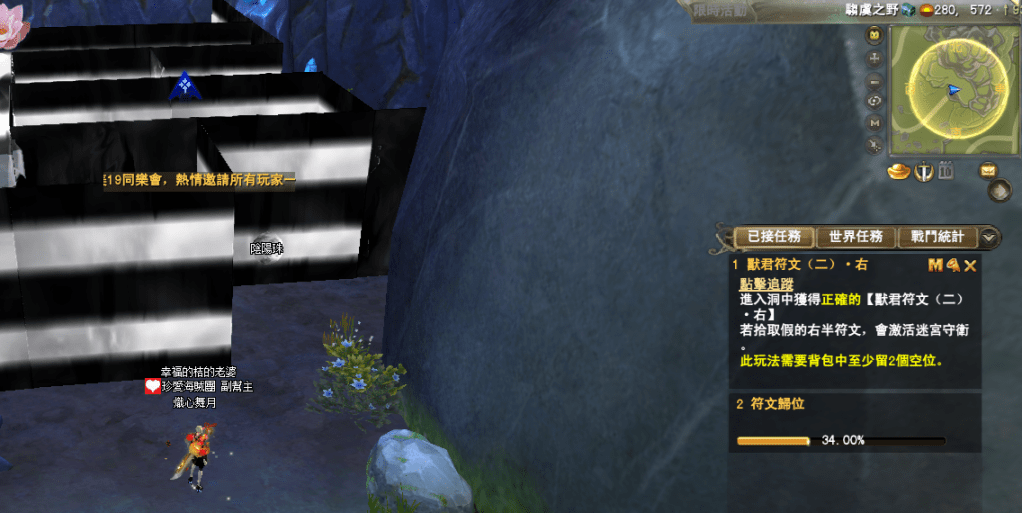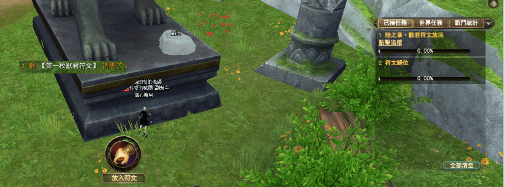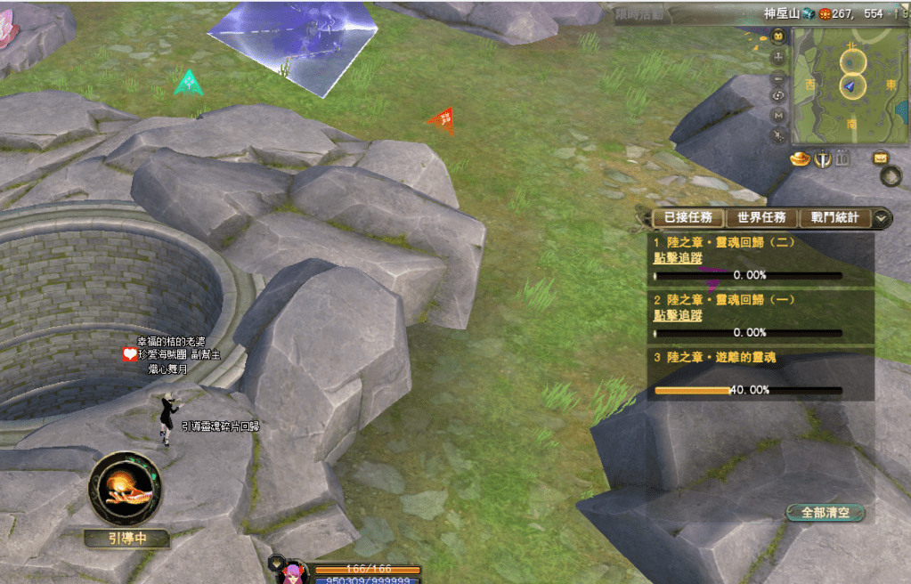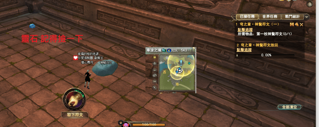 世界-靈山神秀(鷹洞在此篇~此系列 已完結) 2025-11-082025-11-12 熾心舞月 任務文件 打開包包按右鍵 每挖完一個符文記得要先往任務點放上符文 挖到解到符文為止 橋下的水裡 打錯 是變透明後才能移動 若來不及移動(像我在打字或截圖時 牆變白色後 可以利用畫面角度來點陰陽球 啟動) 小怪可以不理會他 方式都一樣 靈石的對面往上飛 就會看見這面牆 靈石要記得挖啊 不然是開不了牆面的 挖完炁後 記得飛起來到下方圖片那挖靈石 完成成就四通五達 分享此文: 按一下即可分享至 X(在新視窗中開啟) X 按一下以分享至 Facebook(在新視窗中開啟) Facebook 喜歡 正在載入... 相關